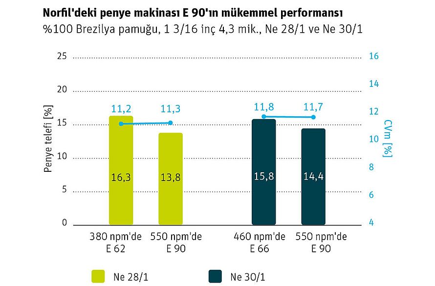 Ring ipliğinde, penye makinesindeki ayarları değiştirmenin etkilerini doğrulamak genelde uzun sürer. Bu noktada E 90'daki RQM, mevcut kalite seviyesi hakkında şirkete sürekli olarak tam ve güvenilir bilgiler ilettiğinden Norfil'e maksimum güvence sağlar. Norfil, E 90'ı kullanarak penye telefi seviyesini de %24'ten %14'e hızlıca değiştirebilir; böylece şirketin çalışma aralığı genişler ve ham maddeden tasarruf edilir. Norfil, günümüzde Ne 30 için %14 oranındaki düşük penye telefi seviyesinde maksimum tutarlılıkla 550 tarama/dak hız ile şerit üretebilmektedir; gerektiğinde 600 tarama/dak seviyesine kolayca hızlanmak için yeterli boşluk payı vardır. Operatörler, kullanıcı dostu işletim ünitesinde ayarları kolayca değiştirebilir; bu sayede değişen pazar koşullarına hızlı yanıt verilmesi sağlanır, bu da değişen piyasa koşullarına hızlı yanıt verilmesini sağlar. E 90 ile sağlanan muazzam penye telefi tasarrufu sayesinde Norfil, kaliteyi korurken aynı zamanda maliyetleri azaltmayı da başardı. Şirket, Rieter teknisyenlerinin proje süresince sağladığı sürekli destekten çok memnundur. Rieter teknoloji uzmanlarıyla iş birliği halinde çalışan Norfil, yeni fikirleri hayata geçirebildi ve bu da kendi özel ihtiyaçları için tasarlanmış yeni bir penye prosesi ile sonuçlandı. E 90, Norfil için en iyi çözümdür ve şirket bir sonraki penye makinası siparişini çoktan vermiştir.